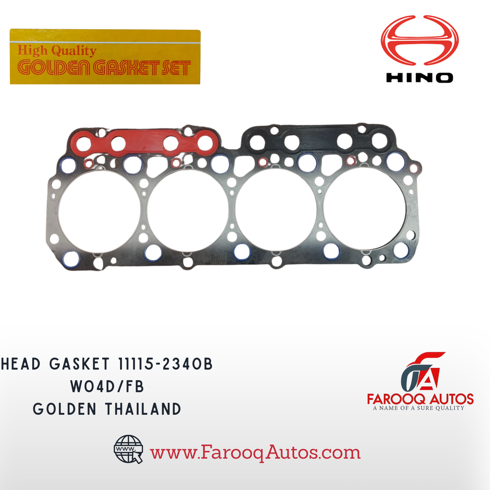 The Hino Head Gasket 11115-2340B is a premium-quality replacement part designed for Hino WO4D and FB engines, offering exceptional durability and performance. Manufactured by Golden Gasket Thailand, this head gasket ensures a tight and reliable seal, preventing leaks and maintaining perfect compression under high temperature and pressure. Ideal for Hino trucks and buses, it delivers long-lasting performance and protects your engine from overheating and damage. This gasket is engineered to meet OEM standards, making it the perfect fit for a heavy-duty Hino truck. Trusted by professionals, Farooq Autos provides genuine and high-quality Hino engine parts across Pakistan. Shop now for the Hino Head Gasket 11115-2340B at www.FarooqAutos.com — your reliable source for Hino WO4D head gaskets, Hino FB engine gaskets, and genuine Hino parts.